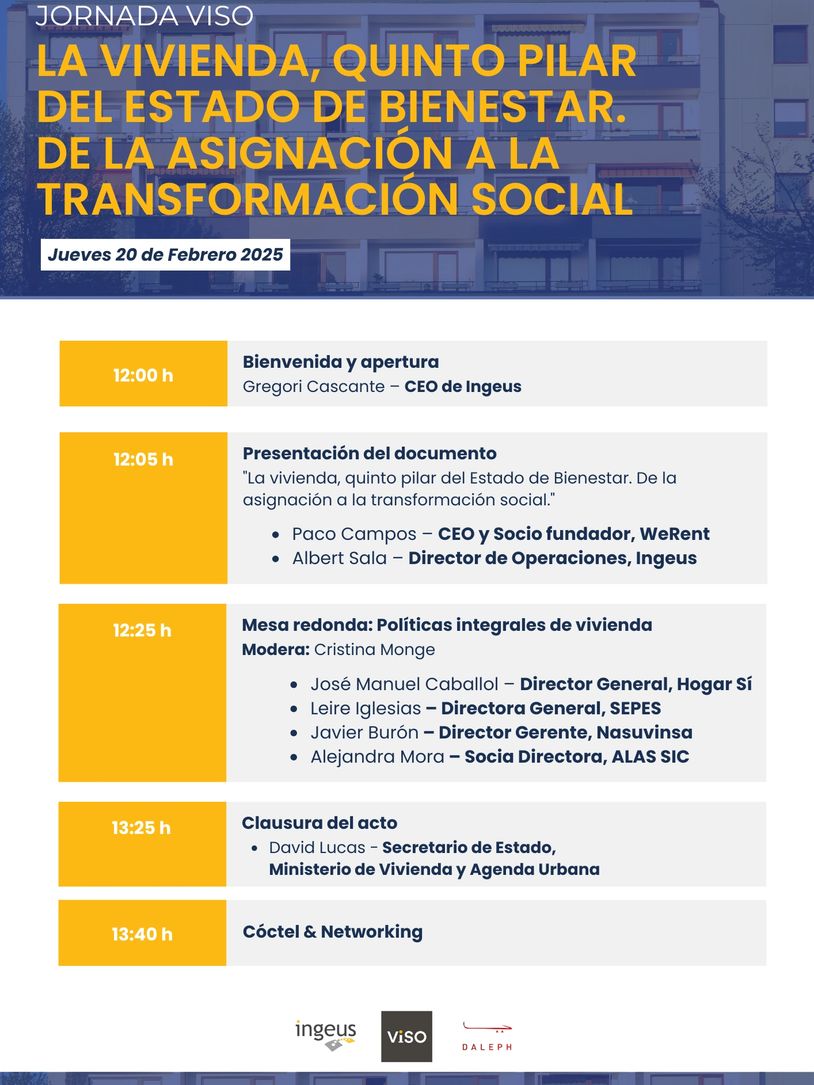 El pasado 20 de febrero, Madrid acogió la Jornada VISO, un evento clave donde expertos del sector social, inmobiliario y público analizaron los desafíos actuales del acceso a la vivienda y presentaron el documento "La vivienda, quinto pilar del Estado de Bienestar. De la asignación a la transformación social".